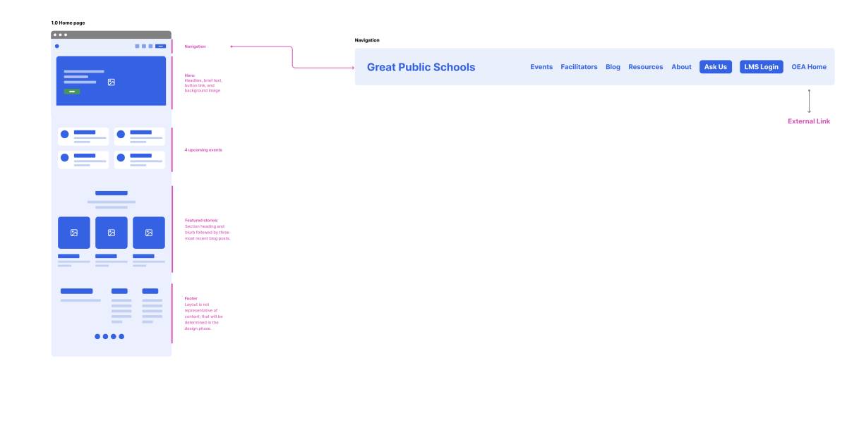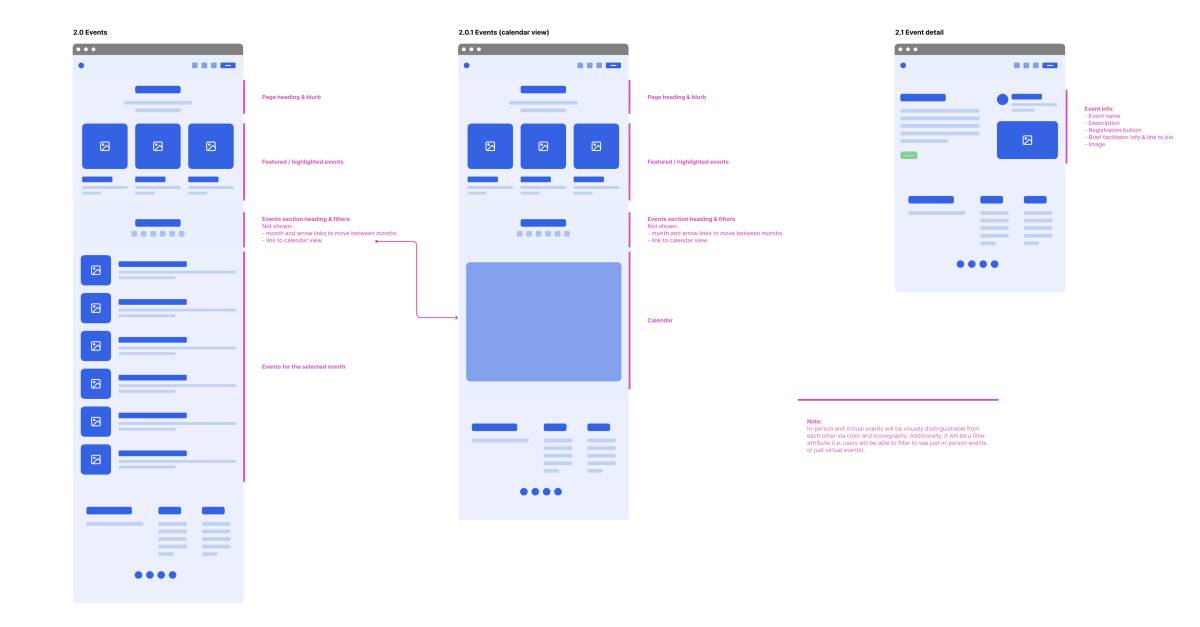 The two screens above are more of a site map and wireframe hybrid. Each page or screen is numerically labeled in an outline fashion (1.0, 2.0, 2.1, etc) to demonstrate the structure and relationship between screens. And each screen then shows the different components or blocks that the page will hold.