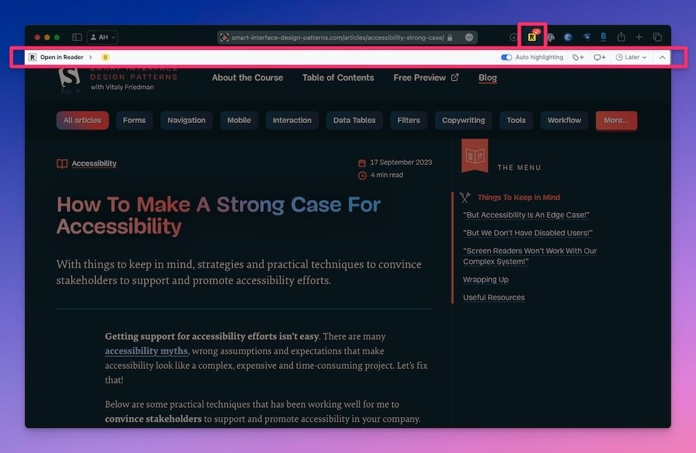 - The highlighting feature of Reader, especially in the browser by way of the extension, is a game-changer—it makes me slow down when I’m reading which means I’m understanding things better.
