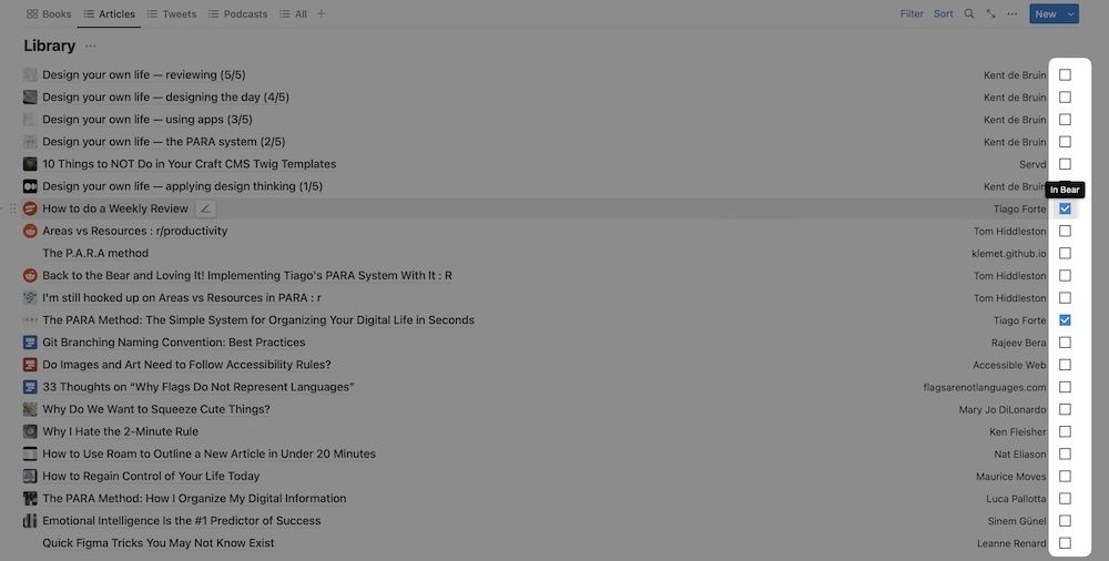 Instead, I chose to sync to Notion because I already use it. From there I added a checkbox to the database that gets created on first sync that indicates whether or not an item has been exported to Bear. If I ever add new highlights or modify existing ones in an article they get synced to Notion. But if I’ve already exported to Bear I’d likely miss those. I’m okay with this because going back and highlighting directly in an article a second time is highly unlikely for me.