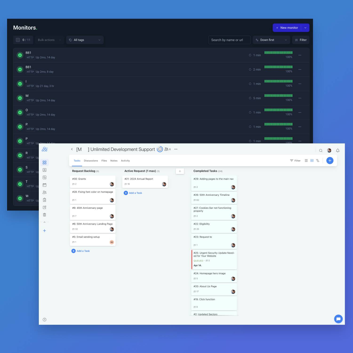 Website support shouldn’t be about waiting for something to break. Our approach combines 24/7 automated monitoring with expert human oversight, catching potential issues before they impact your visitors or business operations. When you do need help—whether it’s a quick content update, a new feature, or troubleshooting an unexpected issue—you’re working directly with experienced professionals who know your site inside and out.