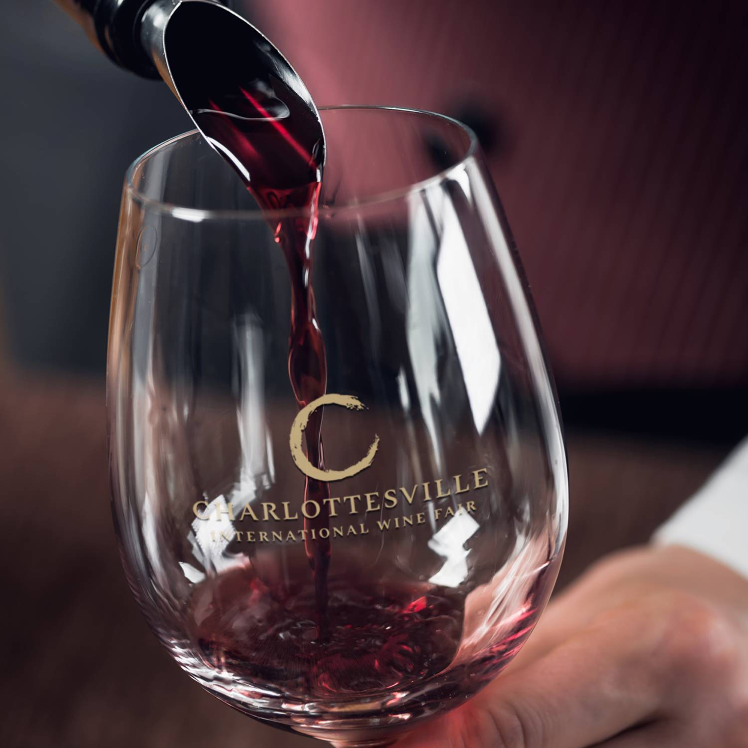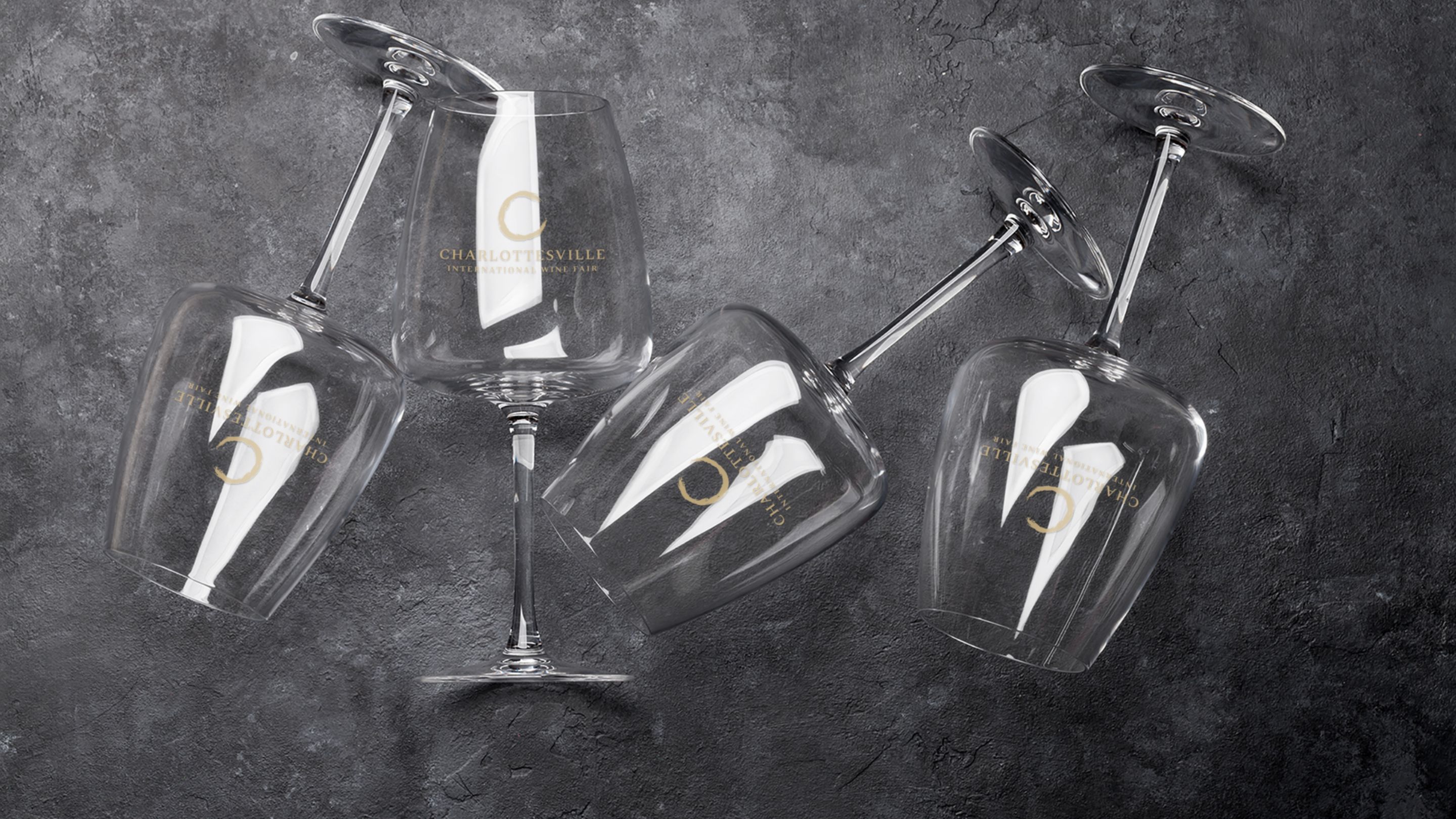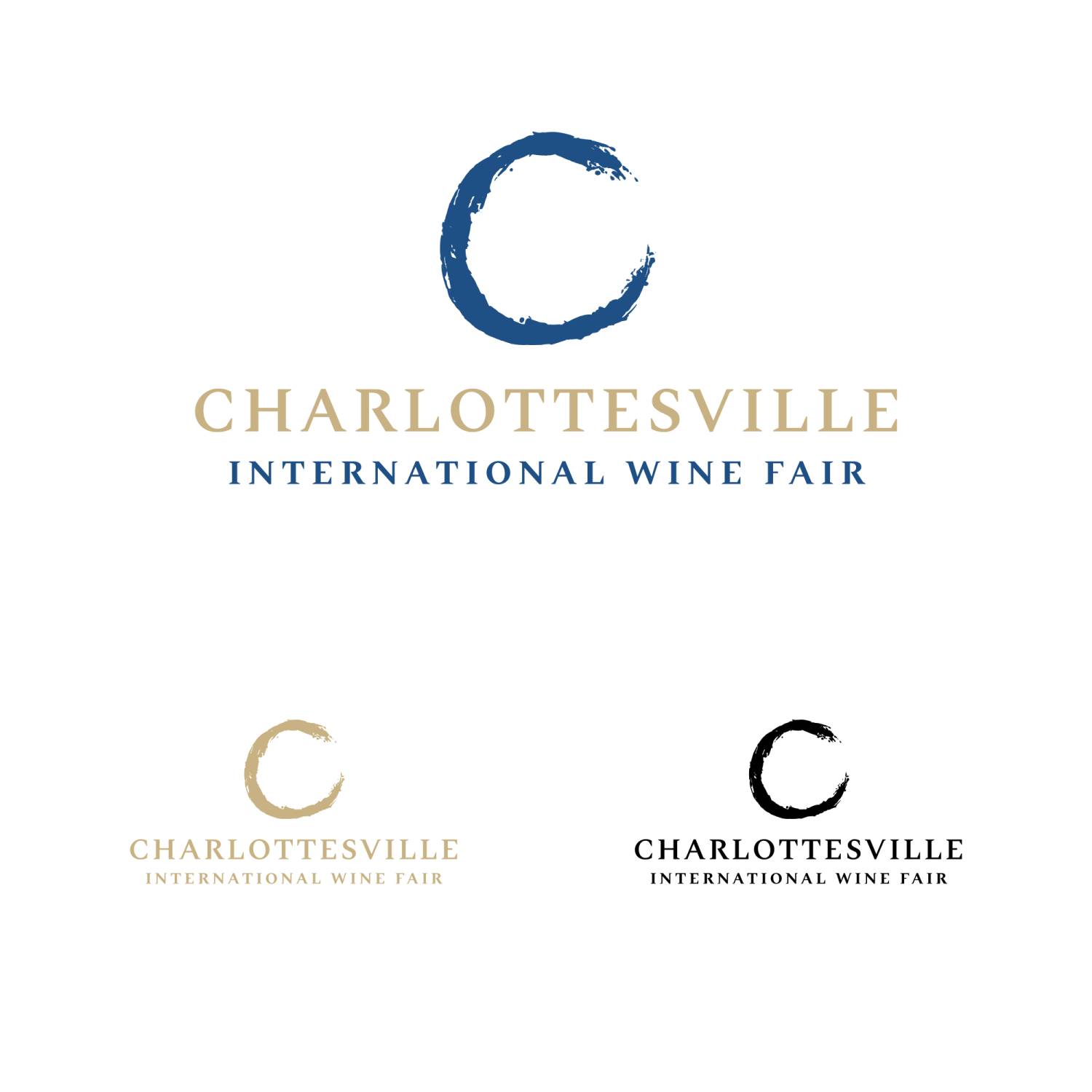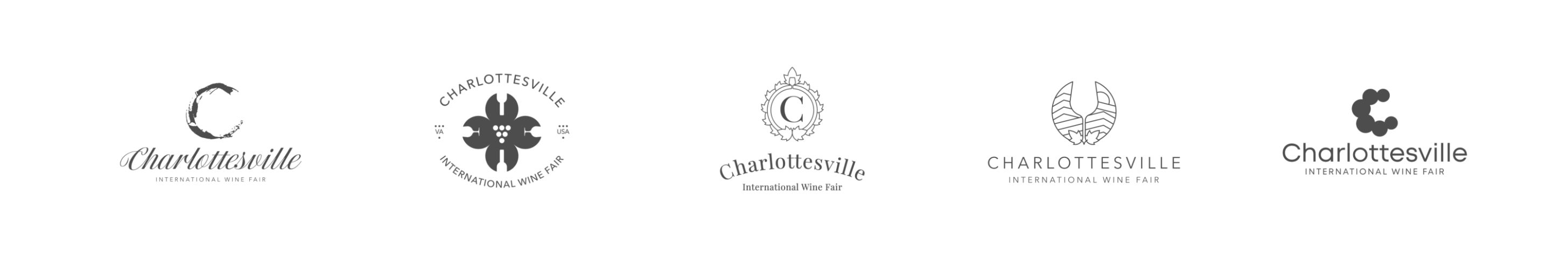 The letter "C" serves double duty: it's the initial letter of Charlottesville while its curved form subtly echoes the base of a wine glass, creating an elegant typographic element.