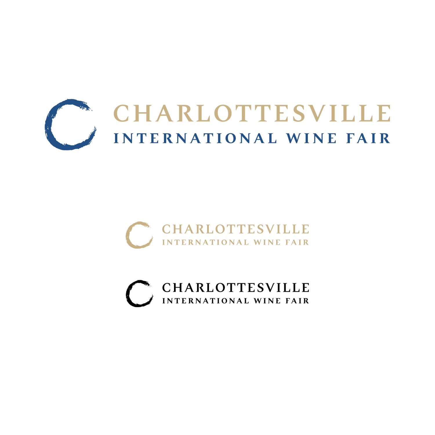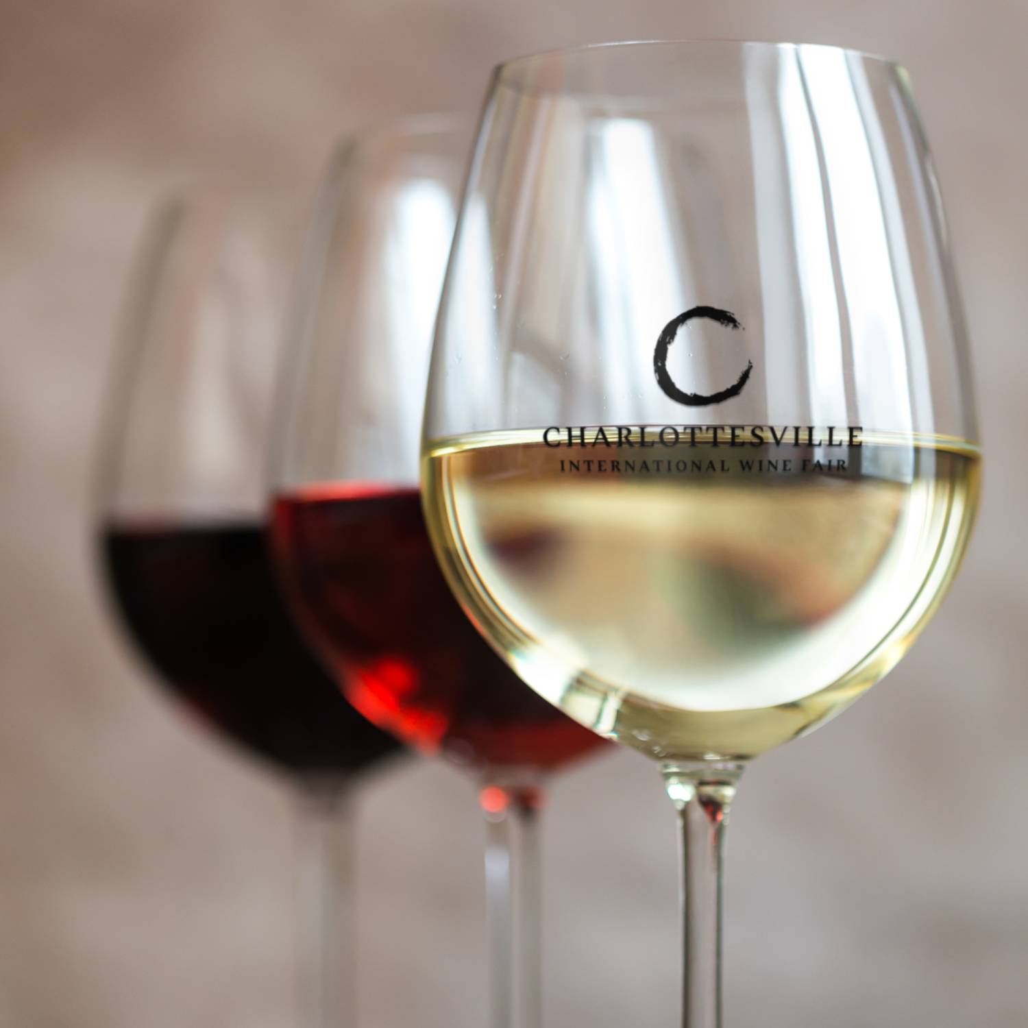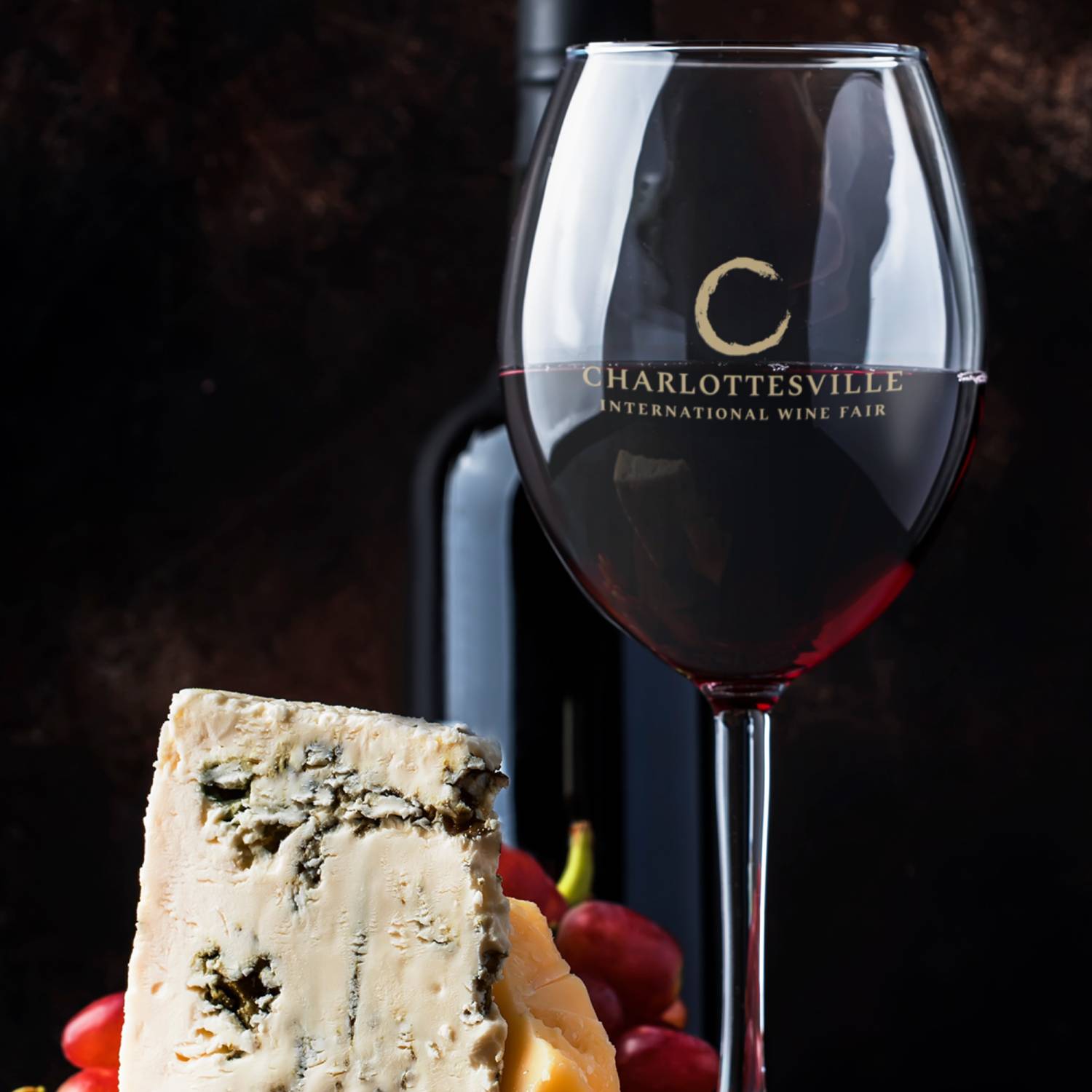 The letter "C" serves double duty: it's the initial letter of Charlottesville while its curved form subtly echoes the base of a wine glass, creating an elegant typographic element.