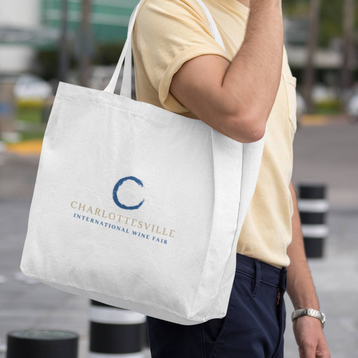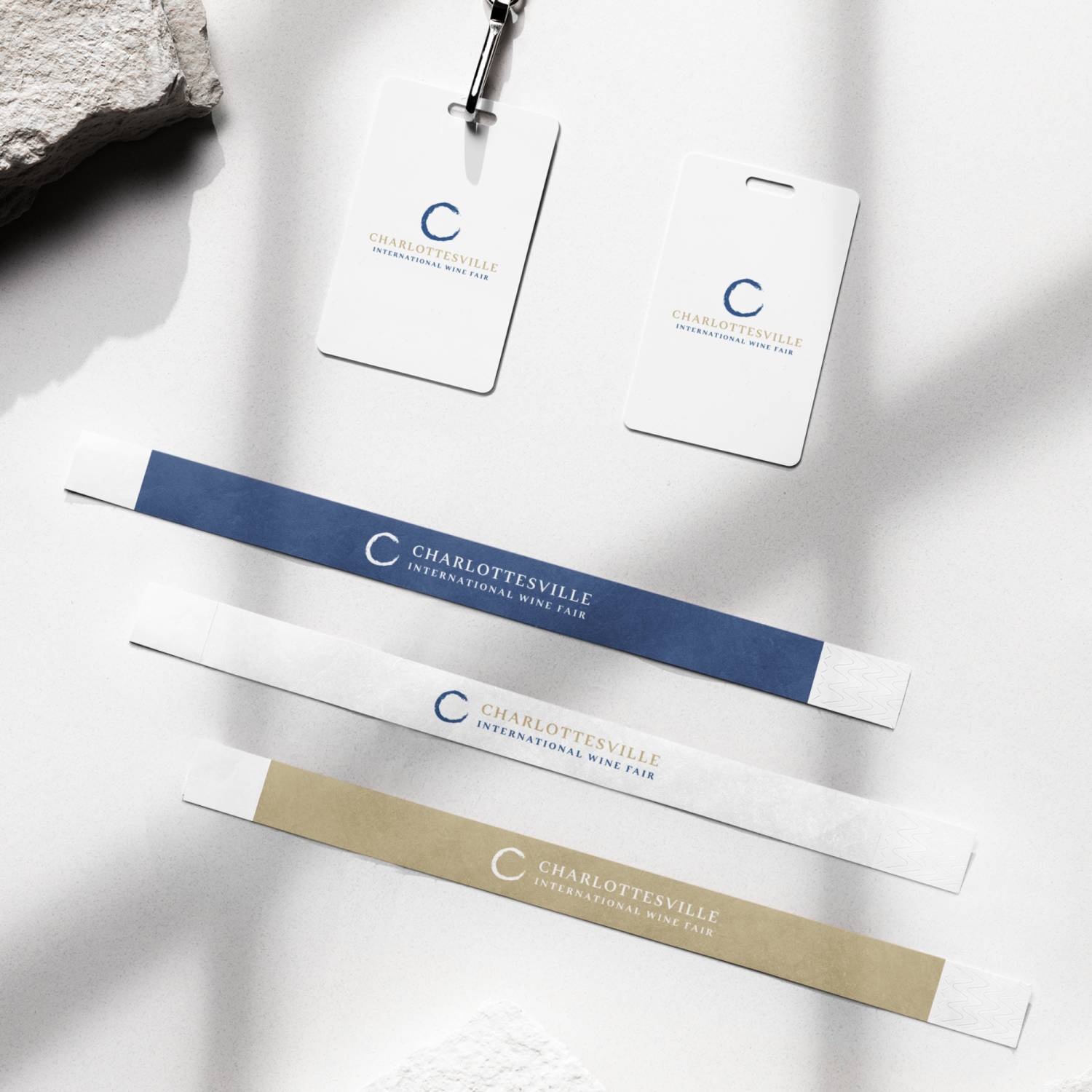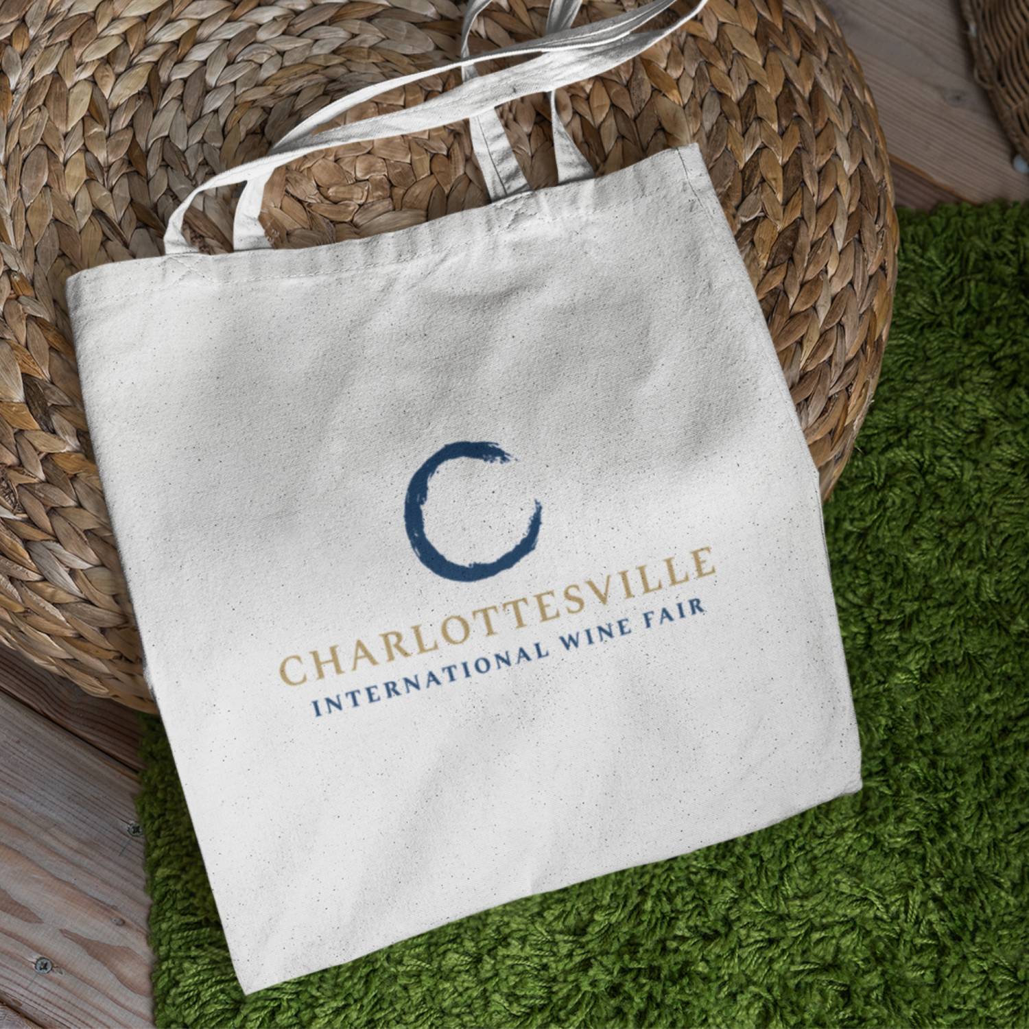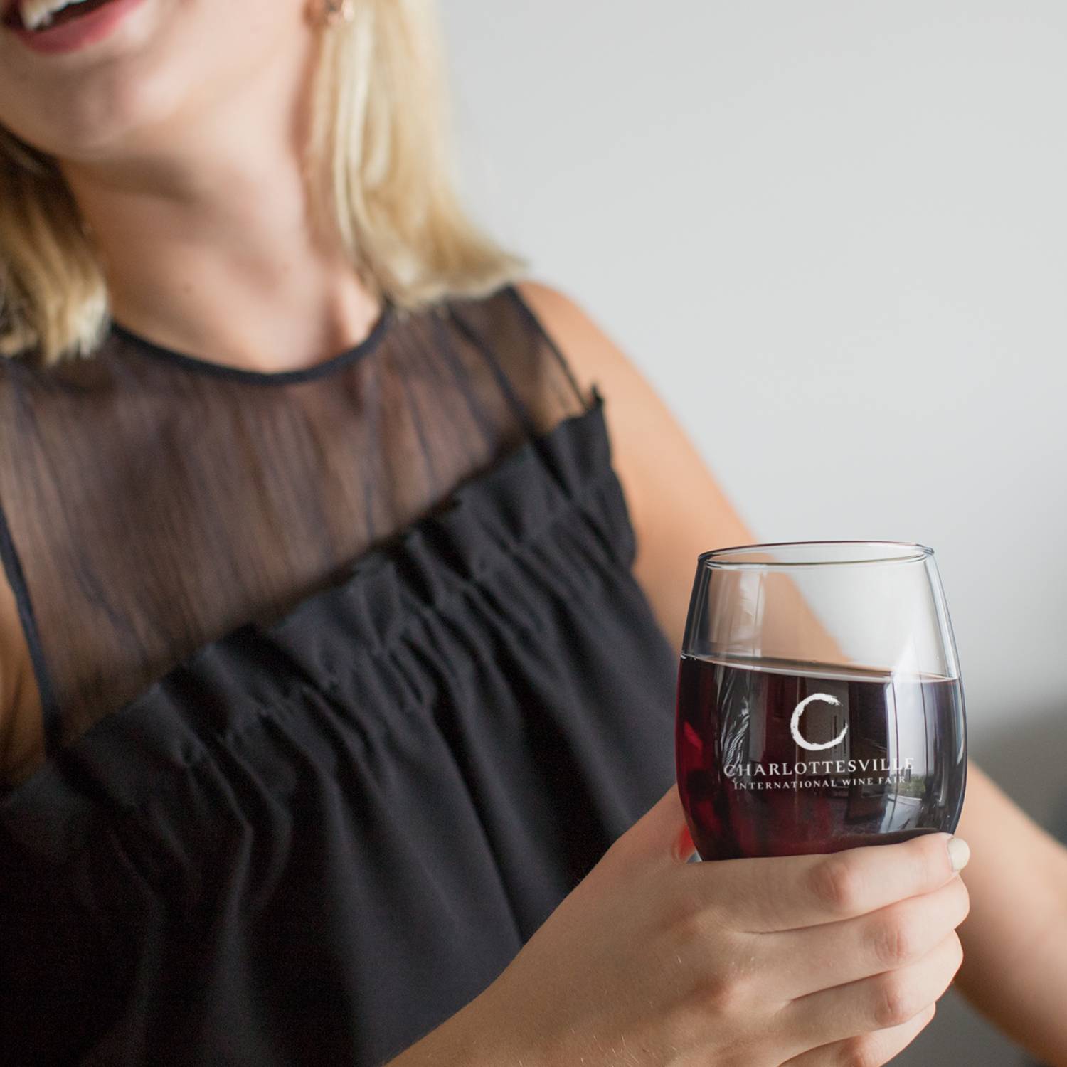 The letter "C" serves double duty: it's the initial letter of Charlottesville while its curved form subtly echoes the base of a wine glass, creating an elegant typographic element.