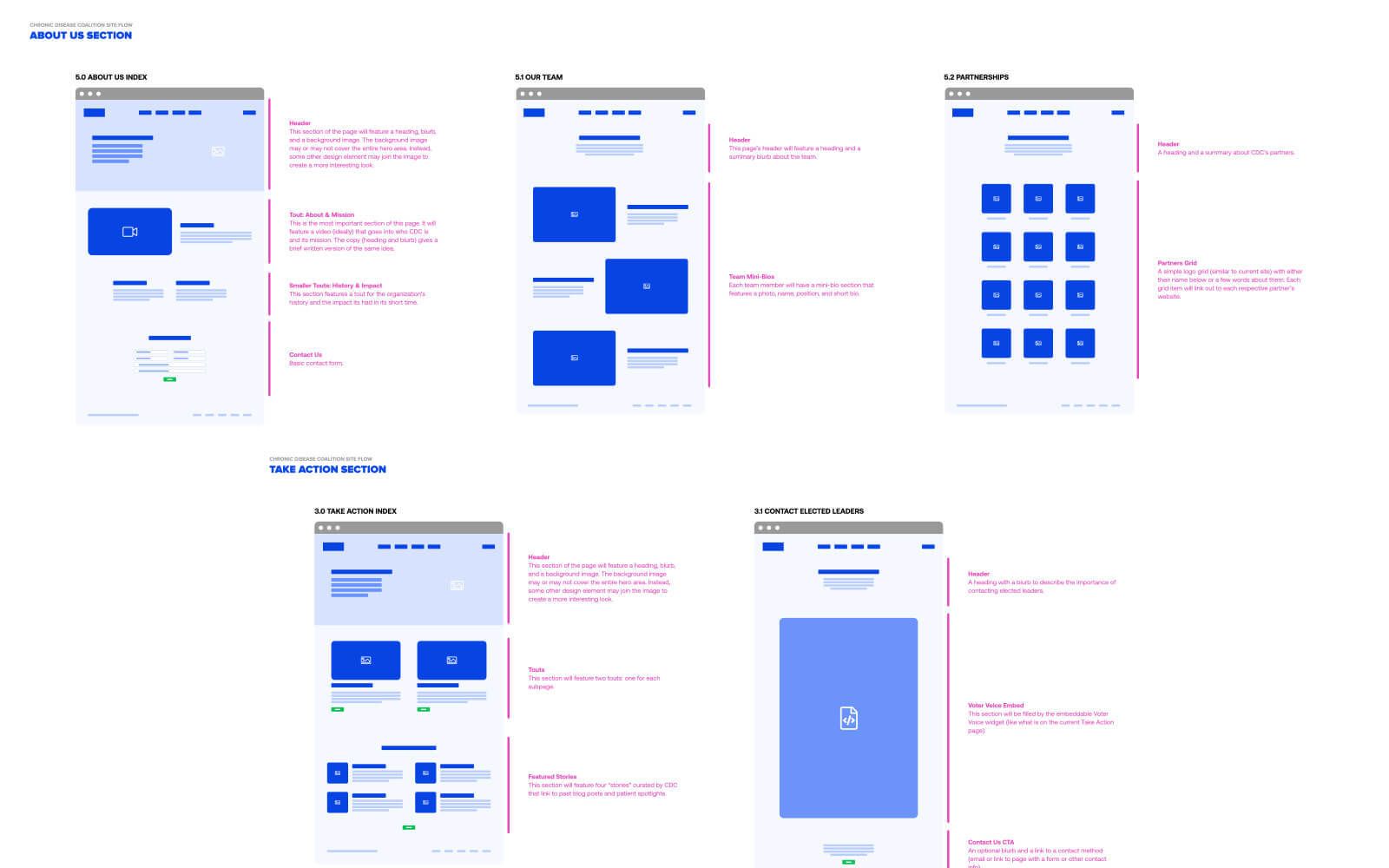 CDC is run by folks who know their stuff and were very clear about the sites goals, usage, and audience. They provided a detailed creative brief that described where they wanted the site to go conceptually that included a rough idea on the site’s content reorganization. We took that and developed iterations of site flow decks – a hybrid of a high-level site map and low-fidelity wireframes.