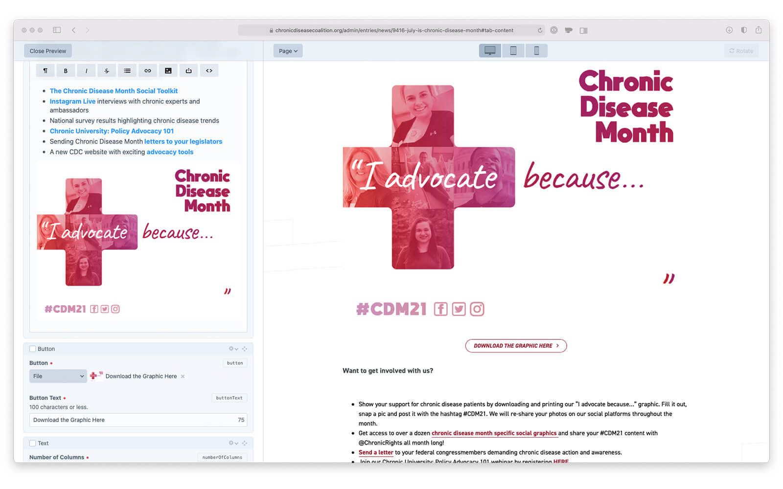 Chronic Disease Coalition’s previous site was hastily built on WordPress. Although it worked just fine, the team at CDC weren’t in love with it. Through clear discussions and understanding their needs and concerns, we agreed that a migration to Craft CMS would suit them well for one major reason: the authoring experience. Craft is a robust CMS whose authoring experience is second to none that has made adding content easy for the CDC team. Additionally, Craft allows for custom organization of content and content types that can greatly add to the authoring experience.