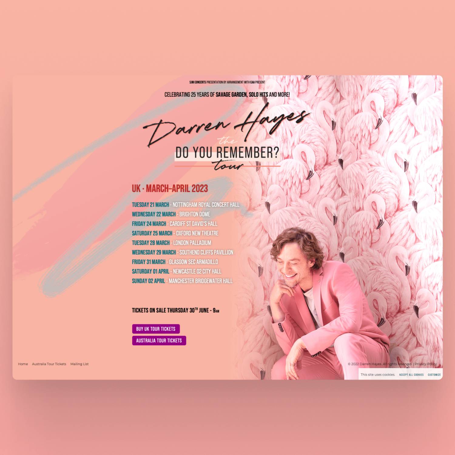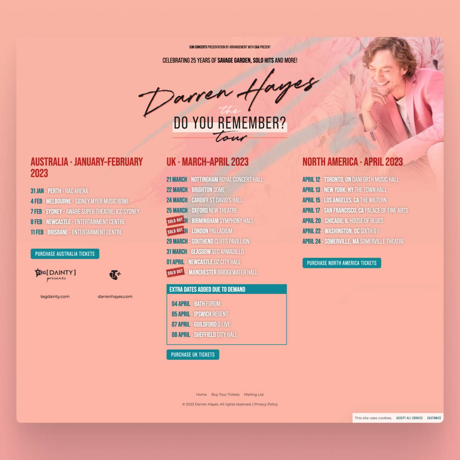 After keeping the tour pages in place for a while, it was time to announce the album. For this, Darren’s album designer provided the artwork we needed for the extremely simple home page—a mirror of Darren’s album cover artwork. The tour information got condensed into a new tour page which now featured the US tour dates, as well as Australia and UK.